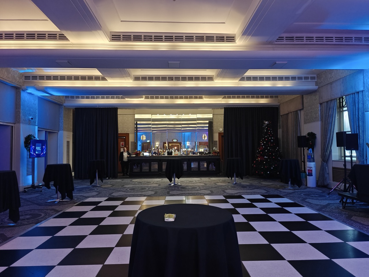 The guests are a very fun group to play for at the Grand Connaught rooms gala. The main event of the dinner, a black-tie ball, starts at seven and runs until nine, leading into an award ceremony managed by AV Projections. AV Projections is the company that has asked us to DJ the afterparty and provides all the sound and lighting tech for the entire show.